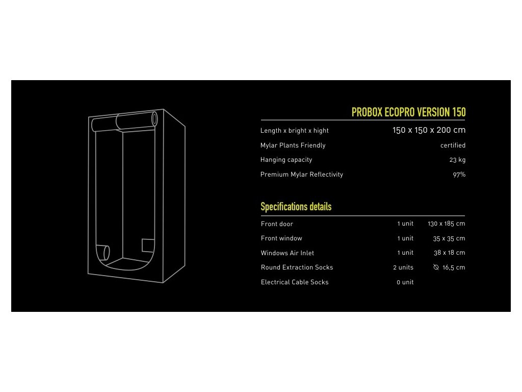 PROBOX ECOPRO 150 growbox na domácí pěstování rostlin, bylinek nebo zeleniny nabízí pěstební plochu 2.25 m2.Kromě toho, že má všechny funkce pro profesionální kultivaci, je vyroben z reflexního termoplastického polymeru Mylar a extra silného 420D nylonu.